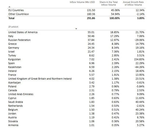 In March 2025, 32.1 million USD (or 89.2 million GEL) was transferred from Georgia, which is 8.5% more as compared to 29.6 million USD in March 2024.