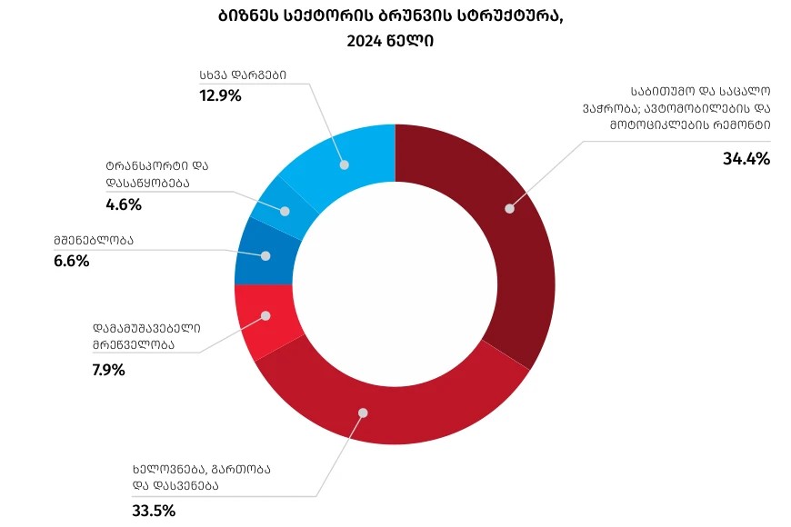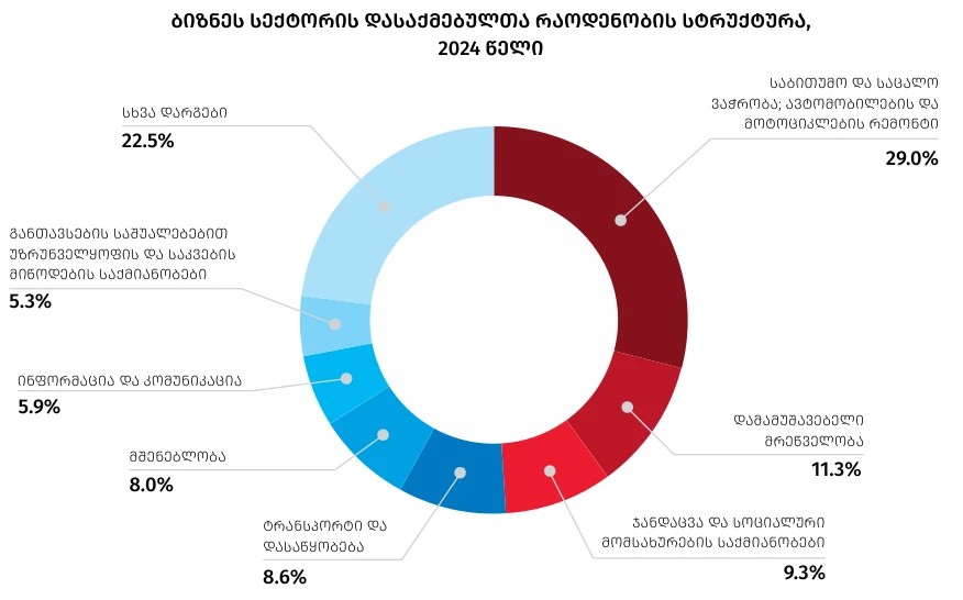 2024 წელს დასაქმებულთა რაოდენობის მიხედვით ბიზნეს სექტორში ლიდერობდნენ ვაჭრობის (საბითუმო და საცალო ვაჭრობა; ავტომობილების და მოტოციკლების რემონტი), დამამუშავებელი მრეწველობისა და ჯანდაცვის და სოციალური მომსახურების საქმიანობების დარგები, შესაბამისად, 29, 11.3 და 9.3%-იანი წილებით.