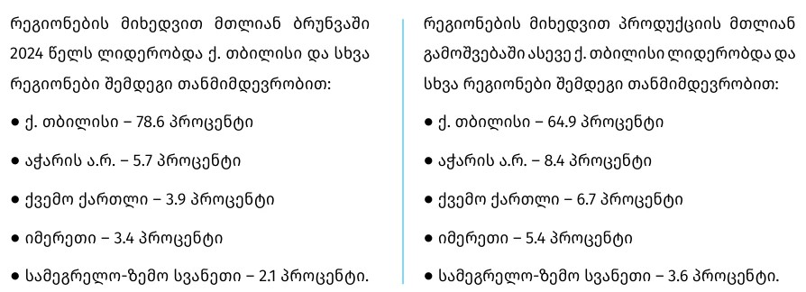 ქვემოთ მოცემული გრაფიკი ასახავს რეგიონების (თბილისის გარდა) მიხედვით ბრუნვასა და პროდუქციის გამოშვებას (მლნ. ლარი):