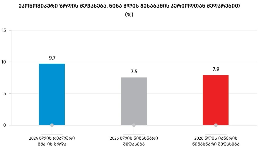 თბილისი (GBC) - საქსტატის წინასწარი შეფასებით, 2026 წლის იანვარში წინა წლის შესაბამის პერიოდთან შედარებით, რეალური მთლიანი შიდა პროდუქტის (მშპ) ზრდამ 7.9% შეადგინა.
