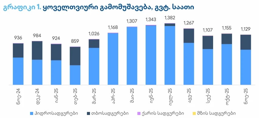 ჰიდროსადგურების გამომუშავება წლიურად გაზრდილია 28.8%-ით (790 გვტ/სთ), ქარის სადგურის გამომუშავება შემცირდა 51.7%-ით (2.9 გვტ/სთ), ხოლო თბოგენერაცია გაზრდილია 5.9%-ით (335 გვტ/სთ). მზის სადგურების გამომუშავებამ ნოემბერში 1.2 გვტ/სთ შეადგინა.