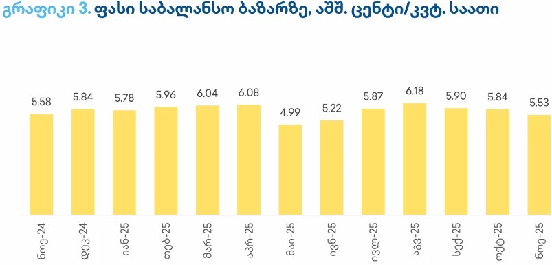 "თიბისი კაპიტალის" კვლევის მიხედვით, 2025 წლის ნოემბერში საბალანსო ელექტროენერგიის საშუალო შეწონილი ფასი ერთ კილოვატ საათზე 5.53 აშშ ცენტს გაუტოლდა, რაც წლიურ ჭრილში 0.8%-იანი შემცირებაა.