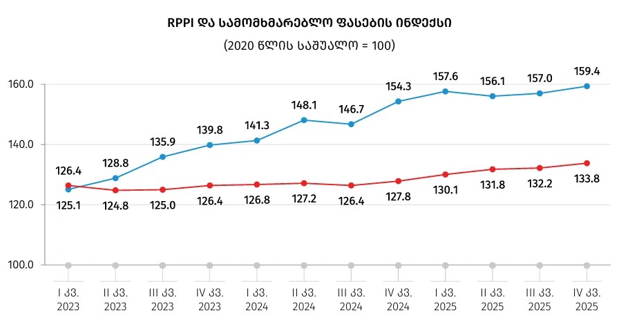 თბილისი (GBC) - საქსტატის მონაცემებით, 4Q25-ში, წინა კვარტალთან შედარებით საცხოვრებელი უძრავი ქონების ფასების ინდექსი (RPPI) 1.5%-ით გაიზარდა, ხოლო ინდექსის წლიურმა ზრდამ 3.3% შეადგინა. 2020 წლის საშუალოსთან შედარებით ინდექსი 59.4%-ით არის გაზრდილი.