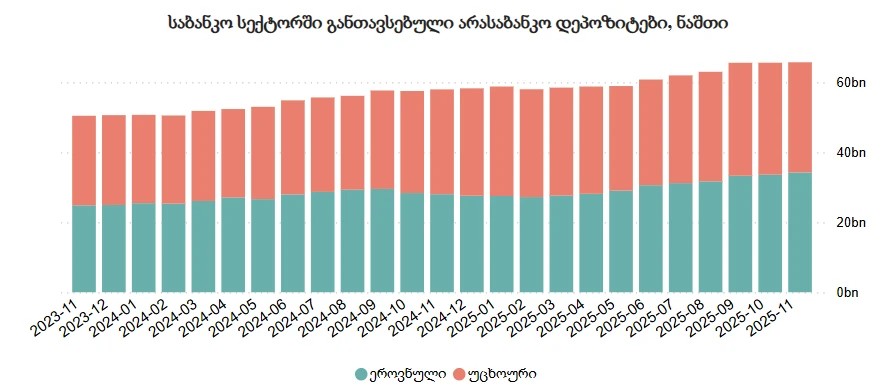 თბილისი (GBC) - სებსტატის მონაცემებით, საბანკო სექტორში განთავსებული დეპოზიტების (ბანკთაშორისი დეპოზიტების გარდა) მოცულობამ 2025 წლის ნოემბრის ბოლოსათვის ₾65.71 მლრდ შეადგინა, რაც ₾131.5 მლნ-ით, 0.2%-ით მეტია წინა თვის ბოლოს არსებულ მაჩვენებელზე (გაცვლითი კურსის ეფექტის გარეშე 0.44%-ით მეტი). დეპოზიტების წლიურმა ზრდამ, გაცვლითი კურსის ეფექტის გარეშე, 13.88% შეადგინა.