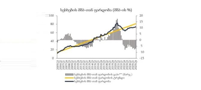 ფსკ - ის შეფასებით, Q4/2025-ში სესხები/მშს შეფარდება გრძელვადიანი ტრენდის ქვემოთ ნარჩუნდება, რის შედეგადაც ფარდობის გაპი კვლავ უარყოფითია, რომლის გახანგრძლივებას, სებ-ის ინფორმაციით, მაღალმა ეკონომიკურმა ზრდამ შეუწყო ხელი.