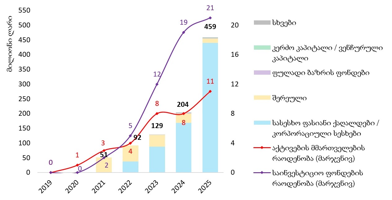 რეგულატორის ცნობით, 2025 წლის 31 დეკემბრის მდგომარეობით ეროვნული ბანკის მიერ 11 აქტივების მმართველი კომპანია და 21 საინვესტიციო ფონდი იყო რეგისტრირებული.