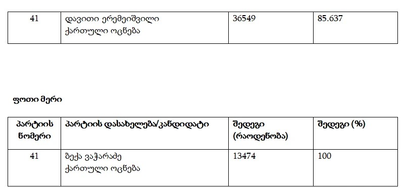 აქვე შეგახსენებთ, რომ საარჩევნო უბნებს საქმიანობა ჯერ არ დაუსრულებიათ, ვინაიდან აპარატების მიერ დათვლის გარდა, კომისიები ხელით დამატებით დაითვლიან შედეგებს, რის შემდგომაც შედგება შემაჯამებელი ოქმები. ახლა საარჩევნო უბნებზე სწორედ ეს პროცესი მიმდინარეობს. მას შემდეგ, რაც შედგება საუბნო შემაჯამებელი ოქმები, როგორც მოდერნიზებულ, ისე ტრადიციულ საარჩევნო უბნებზე, ისინი უმოკლეს ვადაში მოეწოდება ცესკოს, აიტვირთება სპეციალურ ვებგვერდზე results.cec.gov.ge და ხელმისაწვდომი იქნება ნებისმიერი დაინტერესებული პირისთვის.