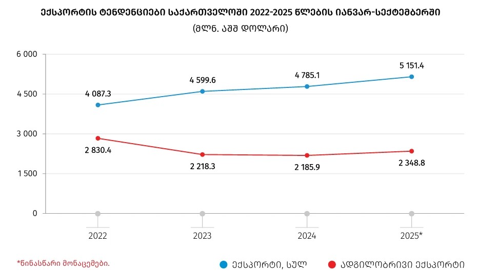 თბილისი (GBC) - საქსტატის მონაცემებით, 2025 წლის იანვარ-სექტემბერში საქართველოდან განხორციელებული საქონლის ექსპორტის მოცულობამ (არადეკლარირებული ექსპორტის გარეშე) $5.15 მლრდ შეადგინა, რაც 7.7%-ით მეტია გასული წლის შესაბამისი პერიოდის მაჩვენებელზე. ადგილობრივი ექსპორტი (ექსპორტი რეექსპორტის გარეშე), მთლიანი ექსპორტის 45.6%-ს შეადგენს. აღნიშნული მაჩვენებელი წინა წლის შესაბამის პერიოდთან შედარებით 7.5%-ით გაიზარდა და $2.3 მლრდ-ს გაუტოლდა.
