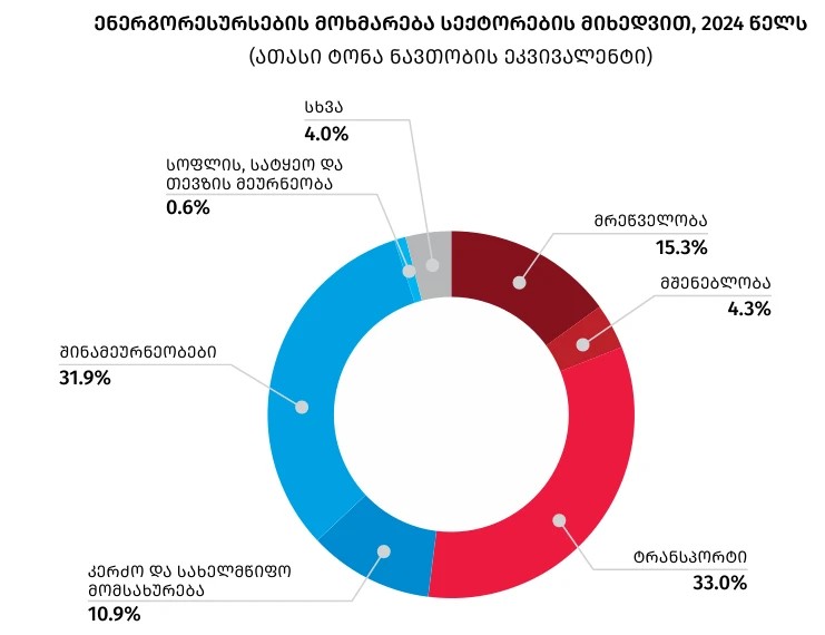 საქსტატის 2024 წლის ენერგორესურსების მოხმარების სექტორული ანალიზი გვიჩვენებს, რომ ენერგორესურსების ყველაზე დიდი მომხმარებელია ტრანსპორტის და შინამეურნეობების სექტორები, რომლებზეც მოდის მთლიანი მოხმარების, შესაბამისად 33 და 31.9%. რაც შეეხება სხვა დარგებს, 15.3% — მრეწველობის, 4.3% — მშენებლობის, 0.6% — სოფლის, სატყეო და თევზის მეურნეობის დარგებზე, ხოლო დარჩენილი 14.9% კი კერძო და სახელმწიფო მომსახურებაზე და სხვა მომხმარებლებზე ნაწილდება.