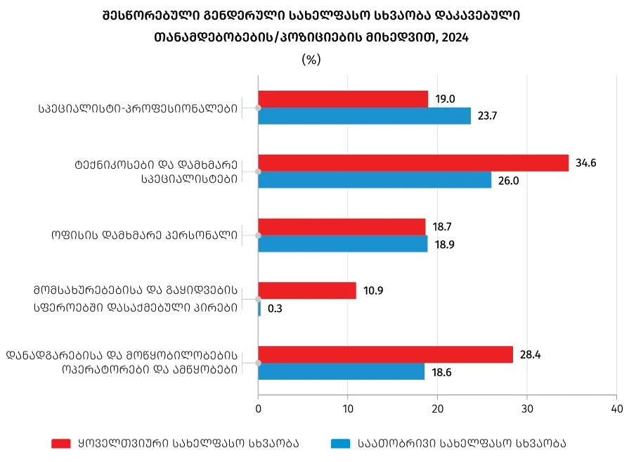 2024 წელს მრეწველობის სფეროში შესწორებულმა გენდერულმა საათობრივმა სახელფასო სხვაობამ 13.9% შეადგინა, ხოლო მომსახურების სფეროში - 11%.
