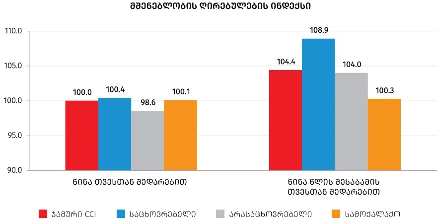საქსტატის მონაცემებით, წინა წლის შესაბამის თვესთან შედარებით მშენებლობის ღირებულების ინდექსი გაიზარდა 4.4%-ით. ინდექსის ზრდა, უმეტესწილად, გამოწვეული იყო მშენებლობის დარგში დაქირავებით დასაქმებულთა საშუალო თვიური ნომინალური ხელფასის 16.1%-იანი ზრდით და მანქანა-დანადგარების ხარჯების კატეგორიის 5.3%-იანი გაძვირებით, რამაც შესაბამისად, 3.87 და 0.34პ.პ. შეიტანა ჯამური ინდექსის ცვლილებაში. ამასთან, 2022 წლის თებერვალთან შედარებით მშენებლობის ღირებულების ინდექსი გაიზარდა 25%-ით.