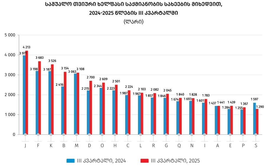 3Q25-ში არასამეწარმეო და საფინანსო სექტორში საშუალო თვიური ხელფასი გასული წლის შესაბამის პერიოდთან შედარებით 187.4 ლარით (10.3%) გაიზარდა და 2 000.9 ლარი შეადგინა. საქმიანობის სახეების მიხედვით შედარებით მაღალი საშუალო ხელფასი აქვთ საფინანსო და სადაზღვევო საქმიანობებში დასაქმებულებს.