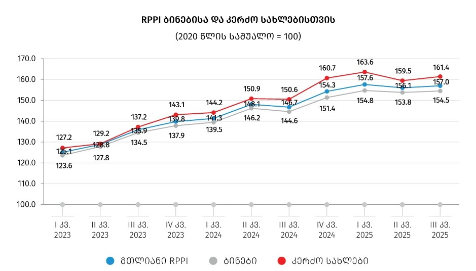 თბილისი (GBC) - საქსტატის მონაცემებით, 2025 წლის მესამე კვარტალში, წინა კვარტალთან შედარებით საცხოვრებელი უძრავი ქონების ფასების ინდექსი (RPPI) 0.6%-ით გაიზარდა, ხოლო ინდექსის წლიურმა ზრდამ 7% შეადგინა. 2020 წლის საშუალოსთან შედარებით ინდექსი 57%-ით არის გაზრდილი.