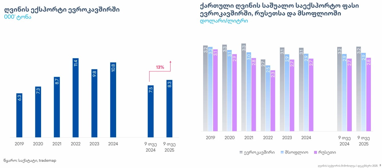 ევროკავშირში ქართული ღვინის ექსპორტი კვლავ იზრდება — 2025 წლის 9 თვეში 13%-ით. ექსპორტის ფასები ევროკავშირში სტაბილურად უფრო მაღალია, ვიდრე გლობალურად და რუსეთში.