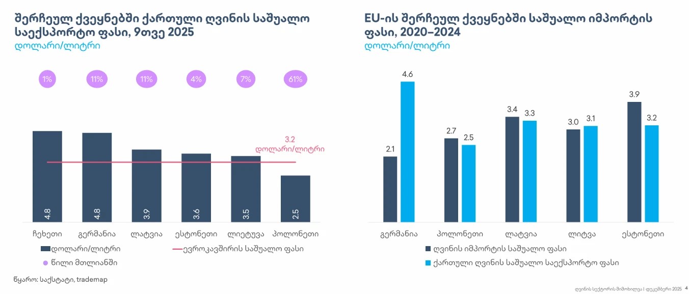 ევროკავშირში ქართული ღვინის ექსპორტის ფასები საკმაოდ განსხვავდება ქვეყნების მიხედვით. შედარებით მაღალი ფასები ისეთ ბაზრებზეა მიღწეული, როგორიცაა გერმანია და ჩეხეთი, მაშინ როცა პოლონეთი კვლავ დაბალი ფასის მაგრამ ექსპორტის მაღალ მოცულობის მქონე დანიშნულების ადგილად რჩება.