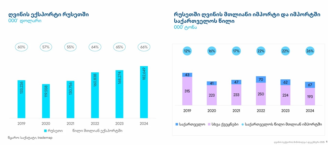 "თიბისი კაპიტალი" წერს, რომ რუსეთი კვლავ რჩევა ქართული ღვინის ძირითად საექსპორტო ბაზრად – 2024 წელს მისი წილი მთლიანი ექსპორტში 66%-მდე გაიზარდა და ქართული ღვინო, რუსეთის ღვინის იმპორტის 26%-ს შეადგენდა.