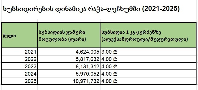 სტატისტიკური დინამიკა აჩვენებს, რომ 2021 წლის შემდეგ (₾4.62 მლნ) სექტორის სახელმწიფო დაფინანსება 137,2%-ით არის გაზრდილი. მიუხედავად იმისა, რომ 1 კგ ალექსანდროულსა და მუჯურეთულზე სუბსიდიის განაკვეთი ბოლო ოთხი წლის განმავლობაში 4 ლარზე სტაბილურად ნარჩუნდება, ჯამური ბიუჯეტის ზრდა წარმოების მასშტაბების გაფართოებასა და გაძვირებულ ლოგისტიკურ ხარჯებს უკავშირდება.