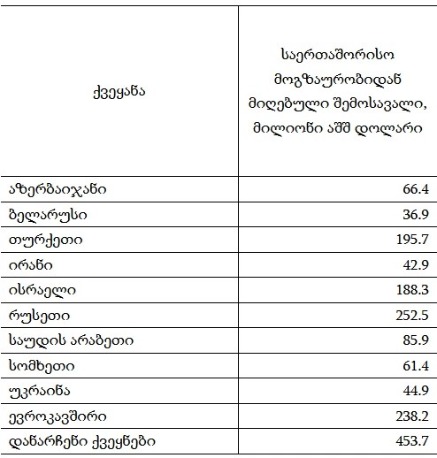 სტატისტიკის მიხედვით, მაღალი ზრდის ტემპით გამოირჩევა აზერბაიჯანიდან და ისრაელიდან მიღებული შემოსავლები, შესაბამისი 36.3% და 28%-იანი წლიური ზრდის ტემპებით.