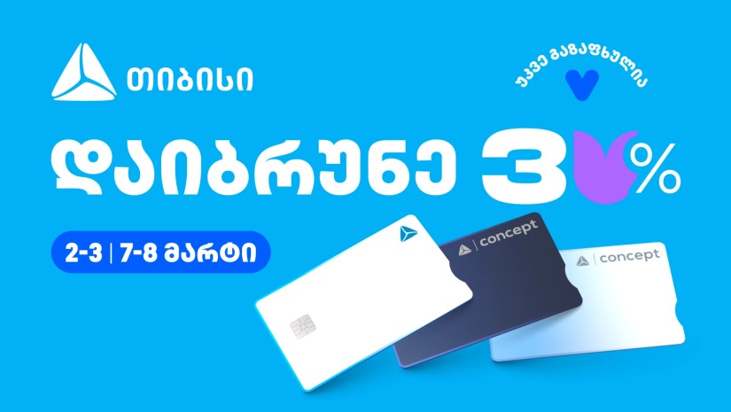 მხოლოდ 2-3 მარტს და 7-8 მარტს, თიბისის ტერმინალზე, ახალი თიბისი ბარათით, ახალი თიბისი კონცეპტ ბარათებითა და ერთგული საკრედიტო ბარათით გადახდისას, მათ გადახდილი თანხის 30% ერთგულის ყულაბაში მომენტალურად დაუბრუნდებათ.