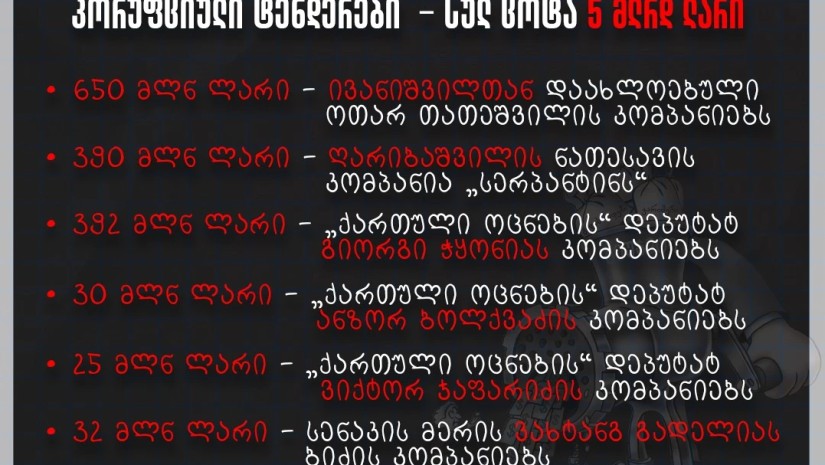 - 5 მილიარდი ლარი, არის ის თანხა, რაც, მხოლოდ „საერთაშორისო გამჭვირვალობა - საქართველოს“ გამოძიებებით, „ქართულ ოცნების“ ჩინოვნიკებმა კორუფციული სახელმწიფო შესყიდვების გზებით მიიღეს ბოლო 10 წლის განმავლობაში. აქედან 3.3 მილიარდი ლარი რეგიონებზე მოდის, ამ თანხის მესამედი კი – 1 მილიარდ 130 მილიონ ლარზე მეტი 2024 წელს დაიხარჯა, მას შემდეგ, რაც პრემიერ-მინისტრი ირაკლი კობახიძე გახდა.