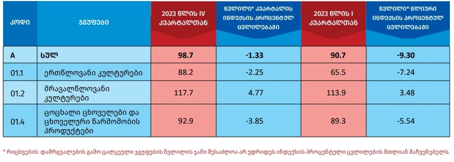 ქვემოთ მოცემულ ცხრილში წარმოდგენილია 2024 წლის პირველ კვარტალში სოფლის მეურნეობის პროდუქციის ერთეულის ღირებულების ინდექსები წინა კვარტალთან და წინა წლის შესაბამის კვარტალთან შედარებით, ასევე ინდექსების ფორმირებაში მონაწილე სასოფლო-სამეურნეო პროდუქტების ჯგუფების შესაბამისი წვლილები:
