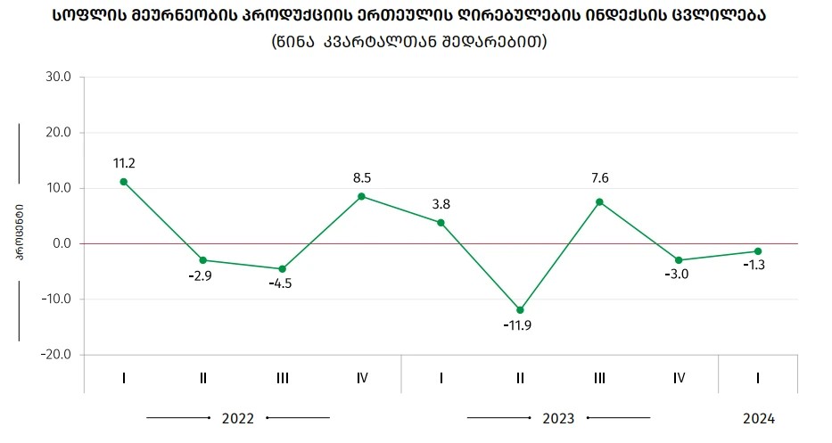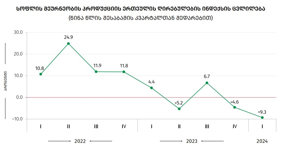 საქსტატის ცნობით, წინა წლის შესაბამის კვარტალთან შედარებით სოფლის მეურნეობის პროდუქციის ერთეულის ღირებულების ინდექსი შემცირდა 9.3%-ით. ინდექსის კლება, ძირითადად, გამოწვეული იყო ერთწლოვანი კულტურების ღირებულების 34.5 პროცენტიანი კლებით, რაც -7.24 პ.პ-ით აისახა მთლიანი ინდექსის ცვლილებაზე. ამავე პერიოდში ცოცხალი ცხოველების და ცხოველური წარმოშობის პროდუქტების ღირებულება შემცირდა 10.7%-ით, რამაც -5.54 პ.პ შეიტანა ჯამური ინდექსის ცვლილებაში.