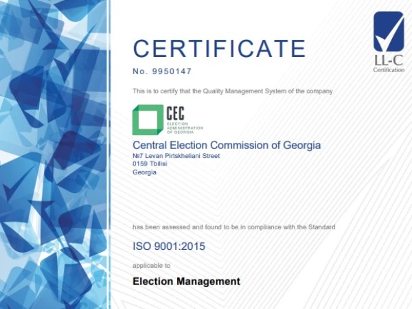 ISO-ს სტანდარტი წარმოადგენს ხარისხის მართვის ერთ-ერთ ყველაზე აღიარებულ საერთაშორისო ჩარჩოს, რომლის მიზანია ორგანიზაციის საქმიანობის ეფექტიანობის, გამჭვირვალობისა და მომხმარებელზე ორიენტირებულობის უზრუნველყოფა.ISO-ს სტანდარტის მოთხოვნებთან შესაბამისობის დადგენის მიზნით, შპს ,,მენეჯმენტის სისტემების’’ აუდიტორის მიერ 2025 წლის 3 ივლისს განხორციელდა შიდა აუდიტი, ხოლო 2025 წლის 19 აგვისტოს დისტანციურად განხორციელდა სასერტიფიკაციო აუდიტი საერთაშორისო აუდიტორების მიერ. ორივე სახის აუდიტი წარმატებით დასრულდა და ცესკომ მოიპოვა მორიგი საერთაშორისო ISO 9001:2015 სერტიფიკატი.საქართველოს საარჩევნო ადმინისტრაციის ხარისხის მართვის სისტემის (QMS) მრავალ დადებით მხარესა და უპირატესობას შორის, აუდიტორის მიერ აღნიშნულ იქნა შემდეგი ასპექტები:· კარგად ჩამოყალიბებული სტრატეგია კონკრეტული შედეგების მისაღწევად;· საარჩევნო პროცესისა და ხმის მიცემის პროცედურების მაღალ დონეზე მართვა/რეგულირება;· არჩევნებში ჩართულ მხარეებთან მუდმივი კომუნიკაცია;· საოლქო და საუბნო საარჩევნო კომისიების წევრების ფართომასშტაბიანი სწავლება და გადამზადება;· ინფორმირების კამპანიის ფარგლებში საარჩევნო ელექტრონული ტექნოლოგიების ფართომასშტაბიანი გამოყენება.აუდიტის შედეგად კიდევ ერთხელ დადასტურდა, რომ ადმინისტრაციის მიზნები, ამოცანები, აქტივობები და პროექტები, შეთავაზებული სერვისები და საქმიანობის მონიტორინგი შეესაბამება ხარისხის მენეჯმენტის მიერ მოთხოვნილ ყველა სტანდარტს.როგორც საერთაშორისო აუდიტორის შეფასებაშია აღნიშნული „ადმინისტრაციის საქმიანობა პასუხობს საერთაშორისო სტანდარტის მოთხოვნებს. დადასტურდა, რომ ორგანიზაციის მენეჯმენტის სისტემა (MS) წარმატებით უზრუნველყოფს დადგენილი სტანდარტის (სტანდარტების) შესაბამისი მოთხოვნების შესრულებას და აკრედიტებული სერტიფიცირებისთვის მოსალოდნელი შედეგების მიღწევას, როგორც ეს განსაზღვრულია ISO IAF-ის კომუნიკეში აკრედიტებული სერტიფიცირების შესახებ. ორგანიზაცია აკმაყოფილებს და შესაბამისად ახორციელებს MS-ის შესაბამის მოთხოვნებს და შეუძლია უზრუნველყოს ამ სერვისის უწყვეტი მიწოდება მომხმარებლის მოთხოვნებისა და შესაბამისი კანონებისა და რეგულაციების შესაბამისად, მომხმარებლის კმაყოფილების გაზრდის მიზნით.“აღსანიშნავია, რომ ცესკოსთვის ხარისხის მართვის საერთაშორისო სტანდარტის შენარჩუნება ნიშნავს არამხოლოდ ეფექტიანი შიდა მენეჯმენტის დემონსტრირებას, არამედ საზოგადოების წინაშე ანგარიშვალდებულებისა დ
