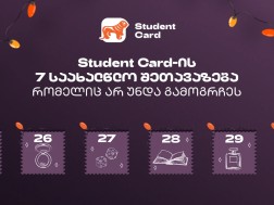შეთავაზების ფარგლებში, სტუდენტებს, ჩამოთვლილ მაღაზიებში, საქართველოს ბანკის Student card-ით გადახდისას, თანხის ნაწილს უკან დაიბრუნებთ.25 დეკემბერი - Dressup-ის ონლაინ მაღაზიასა და აუთლეტში 40%-იანი ქეშბექი;(მაქსიმუმ 100 ლარი)26 დეკემბერი - Kiko Milano-ში 50%-იანი ქეშბექი;(მაქსიმუმ 50 ლარი)27 დეკემბერი - Board Game Corner – ში 50%-იანი ქეშბექი; (მაქსიმუმ 100 ლარი)28 დეკემბერი - Sulakauri Publishing - 40%-იანი ქეშბექი; (მაქსიმუმ 50 ლარი)29 დეკემბერი - Ici Paris – 30%-იანი ქეშბექი; (მაქსიმუმ 100 ლარი)30 დეკემბერი - Miniso - 40%-იანი ქეშბექი; (მაქსიმუმ 50 ლარი)22-31 დეკემბერი - Beko - ს მაღაზიებში Beko-სა და HP-ის ლეპტოპებზე 20%-იანი ქეშბექი. (მაქსიმუმ 300 ლარი)საქართველოს ბანკის Student card-ის აღება შეგიძლიათ ყველას, თუ ხართ 18-23 წლის. მას ძალიან მარტივად, ონლაინ შეუკვეთავთ და ციფრულ ბარათს სულ რამდენიმე წამში გაიაქტიურებთ.საქართველოს ბანკის ყველა შეთავაზება შეგიძლიათ ნახოთ აქ. (R)