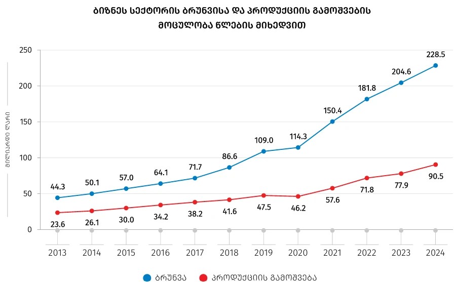 თბილისი (GBC) - საქსტატის მონაცემებით, 2024 წელს, წინა წელთან შედარებით, ბიზნეს სექტორის ბრუნვის მოცულობა 11.6%-ით გაიზარდა და ₾228.5 მლრდ შეადგინა. ზრდის ტენდენციით ხასიათდებოდა ბიზნეს სექტორის პროდუქციის გამოშვების მაჩვენებელიც. 2024 წელს მისი მოცულობა ₾90.5 მლრდ-ით განისაზღვრა, რაც 2023 წლის მაჩვენებელზე 16.3%-ით მეტია.