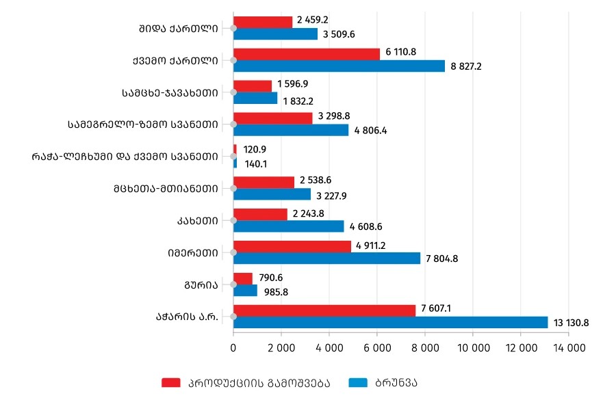 ქვემოთ მოცემული გრაფიკი ასახავს რეგიონების (თბილისის გარდა) მიხედვით ბრუნვასა და პროდუქციის გამოშვებას (მლნ. ლარი):
