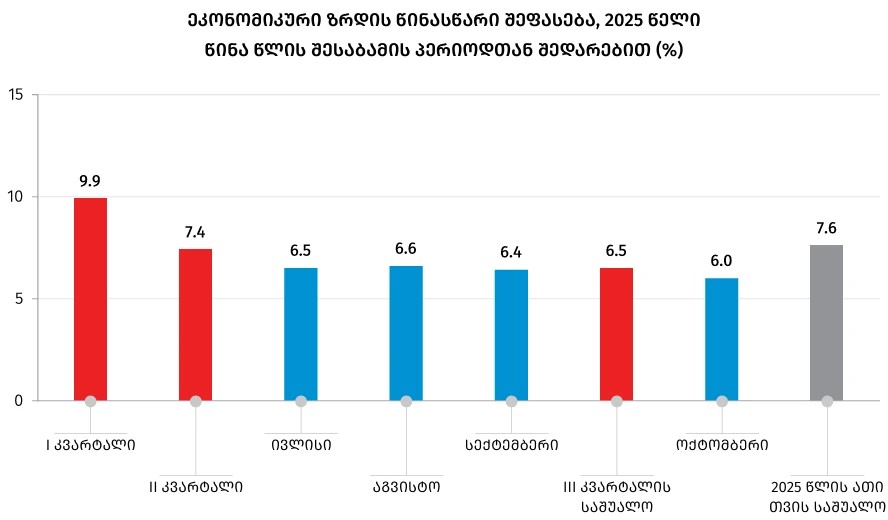 2025 წლის ოქტომბერში, წინა წლის შესაბამის პერიოდთან შედარებით, ზრდის მიმართულებით მნიშვნელოვანი წვლილი შეიტანა შემდეგმა დარგებმა: ინფორმაცია და კომუნიკაცია, ტრანსპორტი და დასაწყობება, საფინანსო და სადაზღვევო საქმიანობები და უძრავ ქონებასთან დაკავშირებული საქმიანობები.