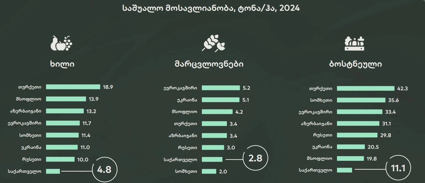 კვლევა აჩვენებს, რომ საქართველოში ერთ ჰექტარზე მოსავლიანობის მაჩვენებელი, ხილის, ბოსტნეულისა და მარცვლოვანი კულტურების შემთხვევაში, მეზობელი ქვეყნებისა და ევროკავშირის შედეგებთან შედარებით დაბალია.