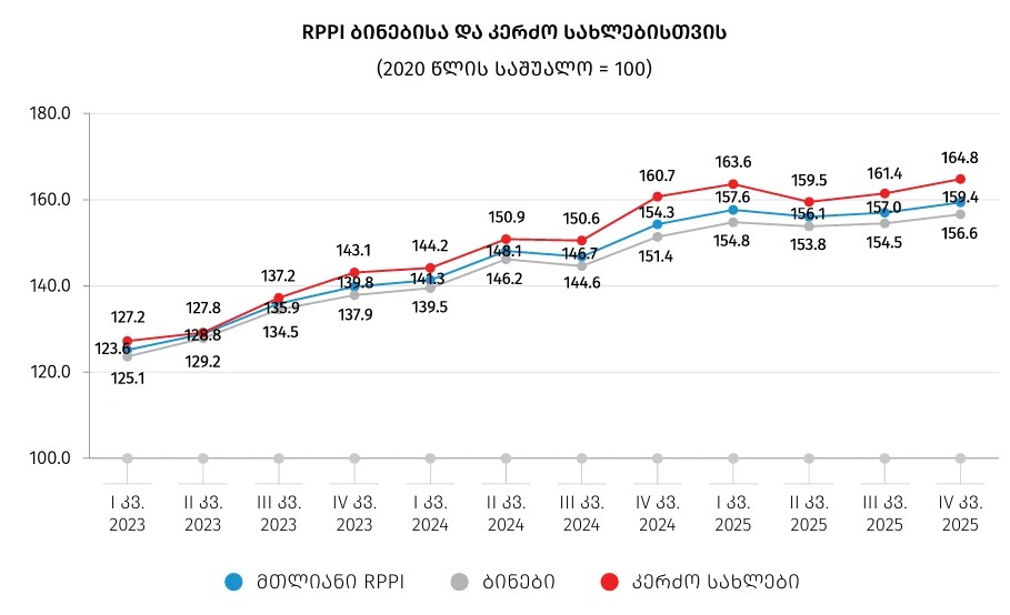 საქსტატის მონაცემებით, 4Q25-თან შედარებით ფასების ზრდა დაფიქსირდა ორივე სეგმენტში - ბინებზე 3.5%-ით, ხოლო კერძო სახლებზე 2.5%-ით.