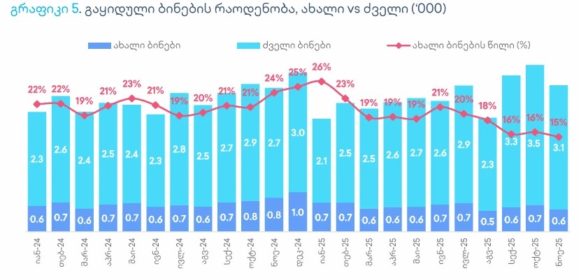 2025 წლის ნოემბერში, თბილისში, ახალი გაყიდული ბინების რაოდენობა წლიურად 35%-ით შემცირდა და 553-ს გაუტოლდა. ძველი გაყიდული ბინების რაოდენობამ 3,074 შეადგინა, რაც წლიურად 13%-იანი ზრდაა. ახალი ბინების წილი ჯამურად გაყიდული ბინების რაოდენობაში 15%-ს გაუტოლდა.