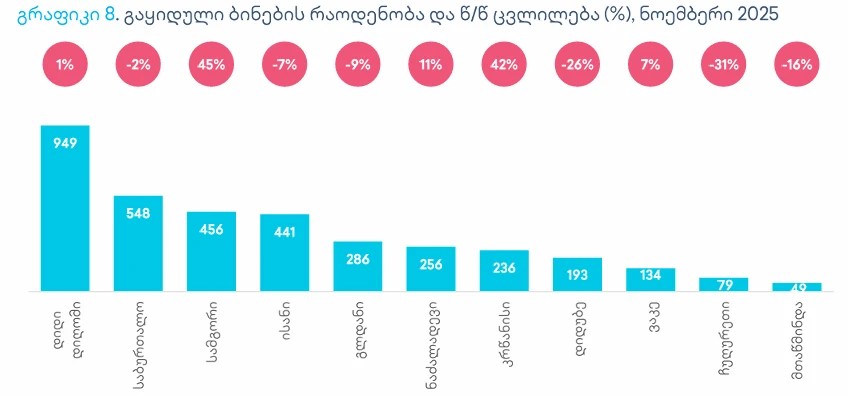"თიბისი კაპიტალის" კვლევის მიხედვით, 2025 წლის ნოემბერში ყველაზე მეტი ტრანზაქცია კვლავ დიდ დიღომში დაფიქსირდა. გაყიდული ბინების რაოდენობის მიხედვით სამგორში ყველაზე მაღალი წლიური ზრდა (45%, წ/წ), დაფიქსირდა, რომელსაც მოჰყვებოდა კრწანისი (42%, წ/წ). ყველაზე პატარა წლიური ზრდა ფიქსირდება ჩუღურეთში.