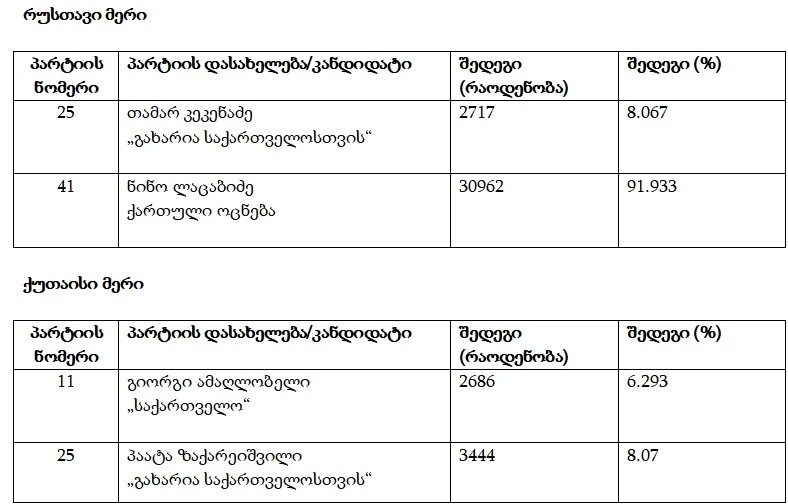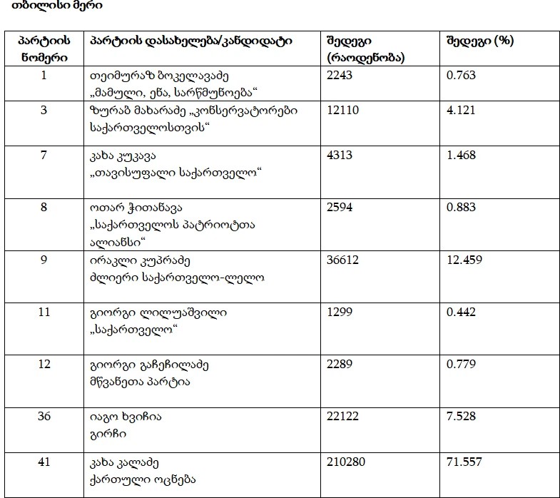 როგორც მოგეხსენებათ, მუნიციპალიტეტის არჩევნები კომპლექსური პროცესია. ტრადიციული საარჩევნო უბნების შემთხვევაში გამოყენებული იყო სამი ბიულეტენი, ხოლო მოდერნიზებულ უბნებზე კი გამოყენებული იყო სამ სვეტად დაყოფილი ერთი ბიულეტენი. ტრადიციულ უბნებზე ხელით დათვლის შედეგები ასევე განთავსდება ვებგვერდზე, მანამდე კი წარმოგიდგენთ დედაქალაქის პროპორციულ შედეგებს, ასევე თბილისისა და დანარჩენი თვითმმართველი ქალაქების მერების არჩევნების პირველად წინასწარ შედეგებს.