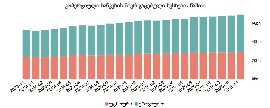 სების მონაცემებით, რეზიდენტი იურიდიული პირებისთვის 2025 წლის ნოემბრის ბოლოს, კომერციულ ბანკებს ეროვნული ვალუტით გაცემული ჰქონდათ ₾11.04 მლრდ-ის (წინა თვესთან შედარებით 2.05%-ით მეტი), ხოლო უცხოური ვალუტით ₾19.35 მლრდ-ის (წინა თვესთან შედარებით 1.4%-ით მეტი) მოცულობის სესხი (გაცვლითი კურსის ეფექტის გარეშე, 1.96%-ით მეტი).