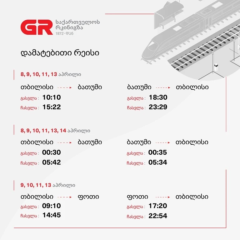 თბილისი (GBC) – აღდგომის დღესასწაულთან დაკავშირებით, გაზრდილი მგზავრთნაკადის გამო, საქართველოს რკინიგზა 8 აპრილიდან 14 აპრილის ჩათვლით, თბილისი-ბათუმისა და თბილისი-ფოთის მიმართულებით მატარებლების რეისებს ამატებს.