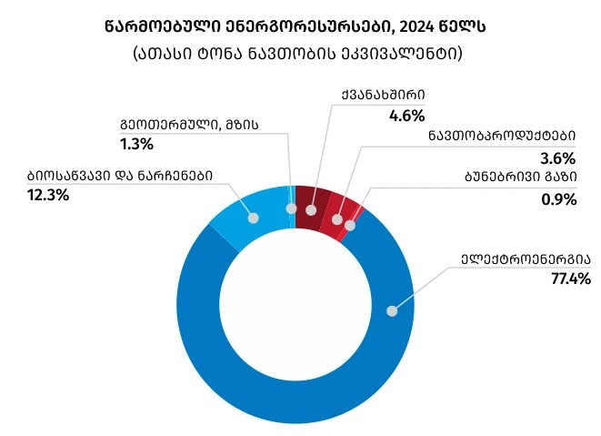 ქვემოთ მოცემული დიაგრამა ასახავს საქართველოში 2024 წელს წარმოებული ენერგორესურსების სტრუქტურას, გაანგარიშებულს ათასი ტონა ნავთობის ეკვივალენტში. წარმოების სტრუქტურაში უდიდესი წილი (77.4%) მოდის ელექტროენერგიაზე, მეორე ადგილს იკავებს ბიოსაწვავი და ნარჩენებისგან წარმოებული ენერგია (12.3%), რომელიც ძირითადად წარმოდგენილია შეშის სახით, ხოლო დანარჩენი სახეობის ენერგორესურსები სტრუქტურაში შედარებით დაბალი წილით ხასიათდება.