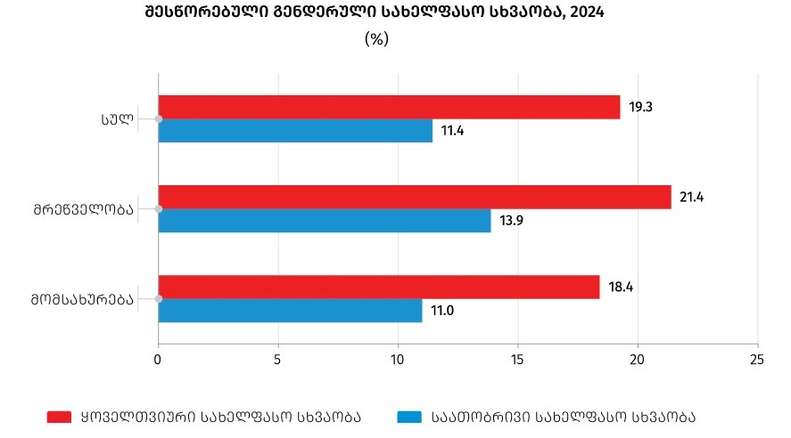 2024 წელს მრეწველობის სფეროში შესწორებულმა გენდერულმა საათობრივმა სახელფასო სხვაობამ 13.9% შეადგინა, ხოლო მომსახურების სფეროში - 11%.