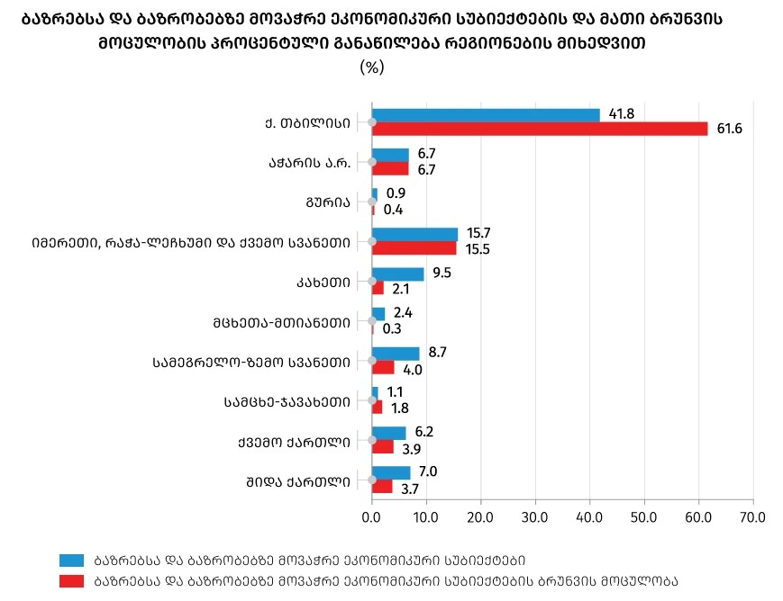საქსტატის გამოკვლევის შედეგების მიხედვით, 2025 წლის ოქტომბერში ბაზრებისა და ბაზრობების ტერიტორიაზე მოვაჭრე ეკონომიკური სუბიექტების სავაჭრო ბრუნვის მოცულობის 61.6% თბილისზე მოდიოდა, 15.5% – იმერეთის, რაჭა-ლეჩხუმის და ქვემო სვანეთის რეგიონზე, 6.7% – აჭარის ა.რ.-ზე, 4% – სამეგრელო-ზემო სვანეთის, 3.9% – ქვემო ქართლის, 3.7% – შიდა ქართლის, 2.1% – კახეთის, 1.8% – სამცხე-ჯავახეთის, 0.4% – გურიის, 0.3% კი – მცხეთა-მთიანეთის რეგიონზე.