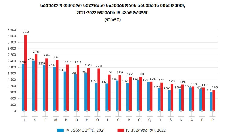 2022 წლის IV კვარტალში დაქირავებით დასაქმებულთა საშუალო თვიური ხელფასი ბიზნეს სექტორში 313.2 ლარით (19.6%) გაიზარდა და 1911.1 ლარი შეადგინა. საქმიანობის სახეების მიხედვით ყველაზე მაღალი ხელფასი ინფორმაცია და კომუნიკაციის (3 773.6 ლარი, წინა წლის შესაბამის პერიოდთან შედარებით გაიზარდა 64.7 პროცენტით), ასევე ხელოვნება, გართობა და დასვენების (2 959.1 ლარი, გაიზარდა 18.3 პროცენტით) დარგებში ფიქსირდება.
