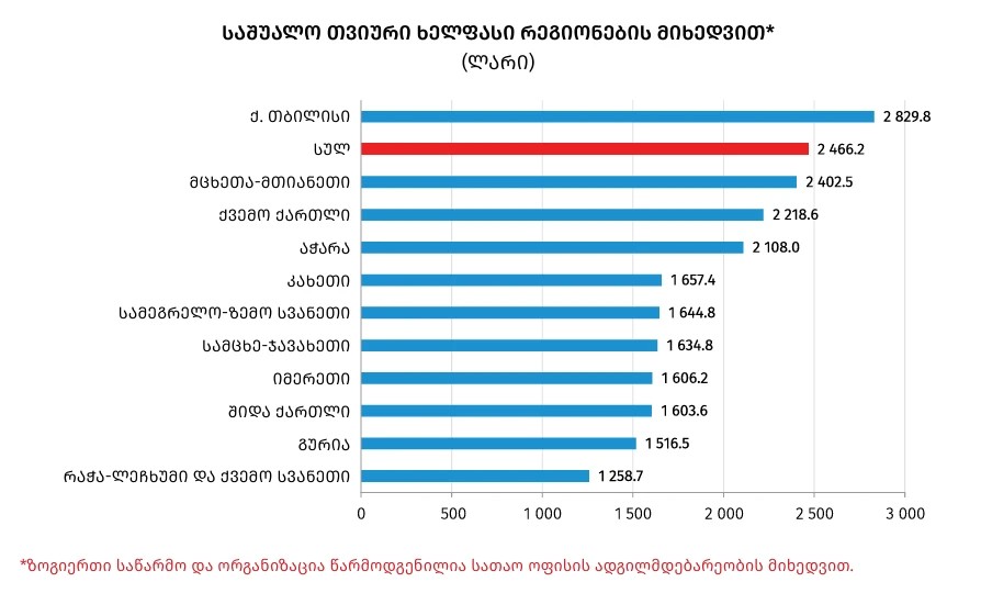 საშუალო ხელფასის სიდიდის მიხედვით რეგიონებში ლიდერია თბილისი და მცხეთა მთიანეთი.