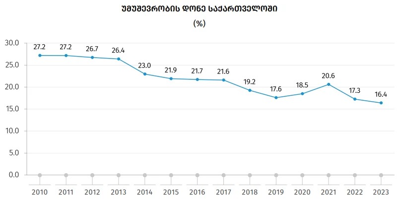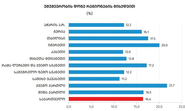 წინა წელთან შედარებით 2023 წელს უმუშევრობის დონე ყველაზე მეტად შემცირებულია რაჭა-ლეჩხუმი და ქვემო სვანეთის, აჭარის და თბილისის რეგიონებში, შესაბამისად 7.7, 6.2 და 2.0 პროცენტული პუნქტით.