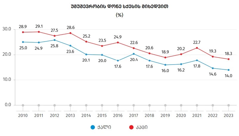 უმუშევრობის დონე ტრადიციულად მაღალია კაცებში, ქალებთან შედარებით. 2023 წელს 2022 წელთან შედარებით, აღნიშნული მაჩვენებელი ქალებში შემცირებულია 0.7 პროცენტული პუნქტით, ხოლო კაცებში - 1.0 პროცენტული პუნქტით.