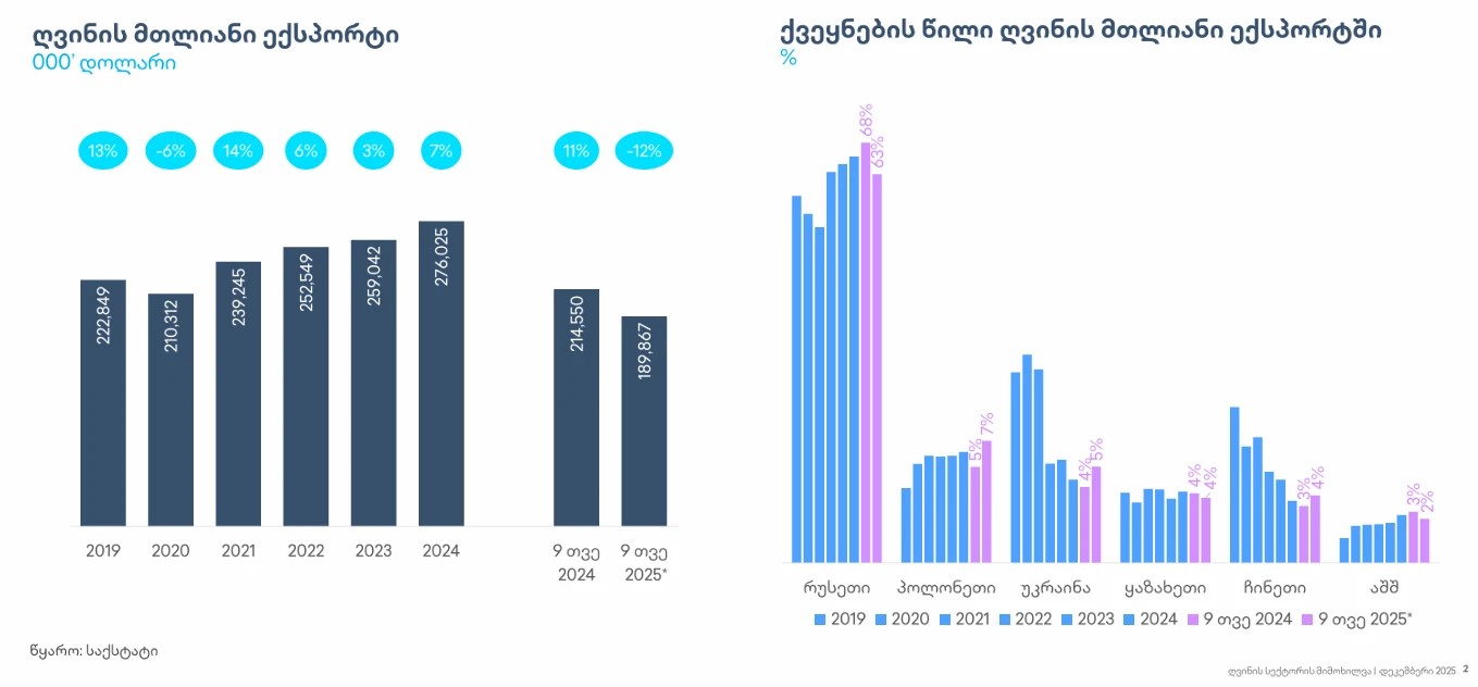 ევროკავშირში ქართული ღვინის ექსპორტი კვლავ იზრდება — 2025 წლის 9 თვეში 13%-ით. ექსპორტის ფასები ევროკავშირში სტაბილურად უფრო მაღალია, ვიდრე გლობალურად და რუსეთში.