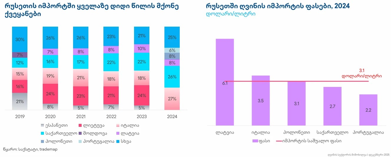 ამასთან, საქართველომ გააძლიერა თავისი პოზიცია, როგორც წამყვანმა მომწოდებელმა რუსეთის ბაზარზე, საშუალო ფასის სეგმენტში კონკურენტუნარიანი შეთავაზებებით — საშუალო იმპორტის ფასებით კვლავ ჩამოუვარდება იტალიას, პოლონეთსა და ლატვიას.
