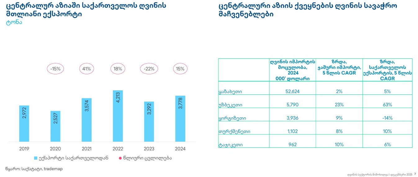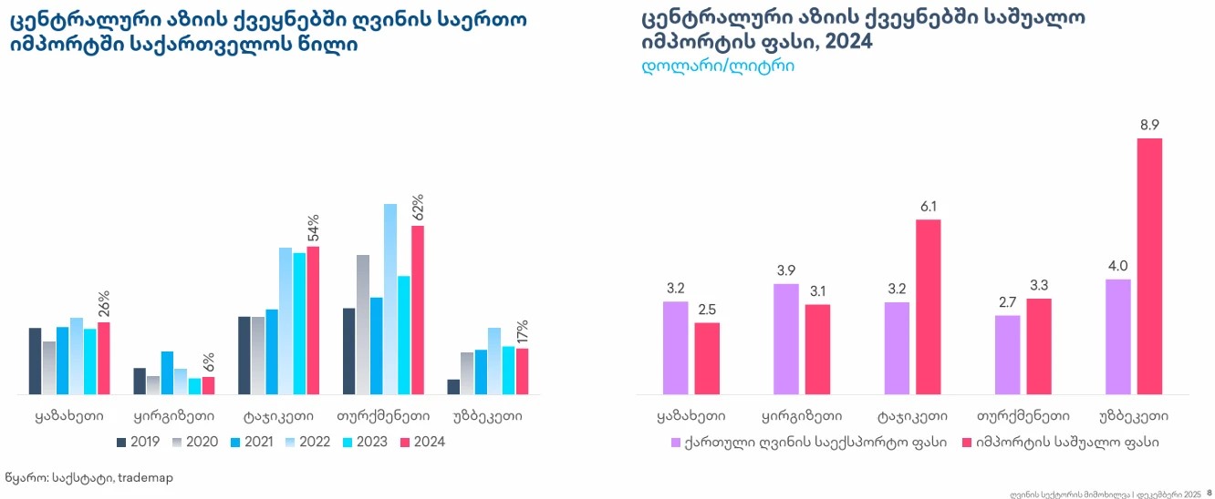 ცენტრალური აზიის ქვეყნების ღვინის იმპორტში საქართველოს წილი სტაბილურად იზრდება - კონკრეტული ფასებით, რომლებიც უმეტეს ქვეყნებში ბაზრის საშუალო მაჩვენებლებს ემთხვევა ან ნაკლებია, რაც კიდევ უფრო ზრდის ქართული ღვინის მიმზიდველობას ამ სწრაფად მზარდ ბაზრებზე.